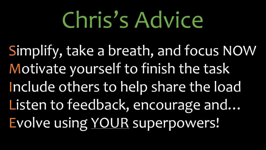 • A call to action, or a personal mantra that has made you successful (what I call the “SMILE” technique, with the caveat that you don’t need to change, but you DO need to embrace your neurodiverse superpowers):