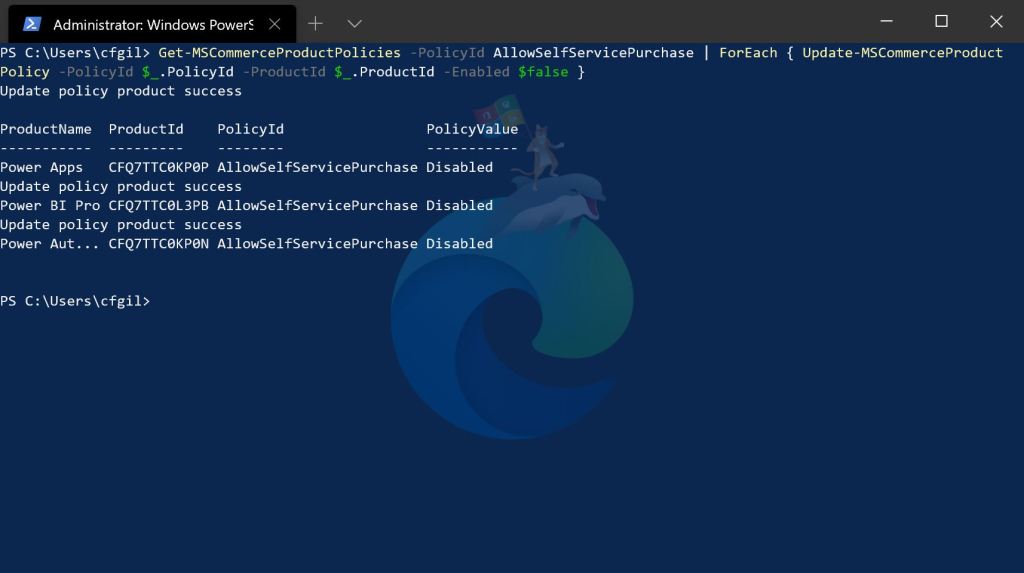 To that end, if you or your organization does decide that it’s necessary to disable Self-Service purchasing in Office365, the following PowerShell cmdlets will be incredibly useful to you. To begin, ensure that the account you will use is either a Global Administrator or a Billing Administrator, then open a new PowerShell instance (I prefer using Windows Terminal for this). Reference this URL for the MSCommerce commands as recommended below: