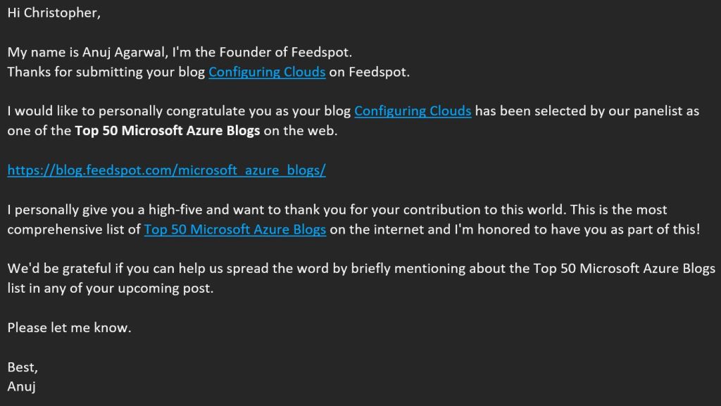 Yesterday morning, I received the following from the founder of feedspot.com: